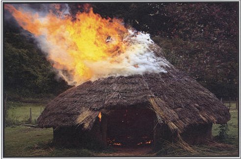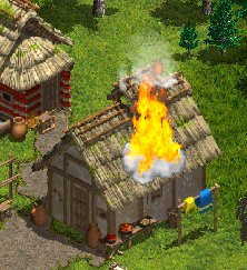 Etwas schwieriger ist die erste Gruppe zu erzeugen. Das klingt im ersten Moment unsinnig, denn man braucht ja nur die Animation im Spiel ablaufen lassen. Das Problem ist allerdings die Transparenz! Nehmen wir das Feuer als Beispiel. Als Grundlage dient ein Foto, das ein brennendes Keltenhaus zeigt: